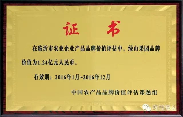 近日,由浙江大學CARD中國農業品牌研究中心發起,中國農產品品牌價值評估課題組對臨沂市農業企業產品品牌價值評估報告出爐。山東輝煌食品有限公司旗下品“綠山果園”品牌價1.24億元人民幣。這是輝煌公司眾多榮譽中近日又獲得一項殊榮,輝煌人將繼續秉承“互利共贏、基業長”的經營理念,“誓做中國罐頭行業第一品牌”的企業愿景,將企業做大做強,造福員工,回饋社